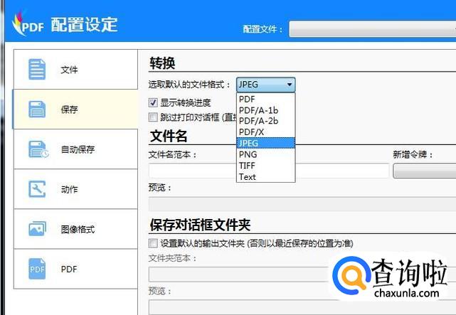 打开软件的设置界面之后,点击软件界面左侧的保存选项,然后在选取默认的文件格式选择中,将默认的文件格式更改为JPEG格式,将软件所打印的文件格式就更改为JPEG图片格式了。