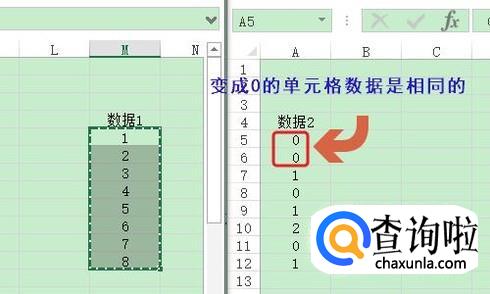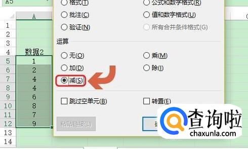 在弹出的选择性粘贴对话框,我们勾选“减”然后确定,之后数据2列表中变成0的区域就是数据内容相同的区域,其余的则是数据存在差异的,如图所示...
