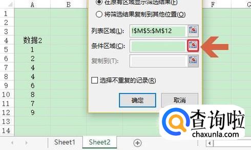 然后我们按住鼠标左键框选数据1下面的所有数据,然后将此对话框移动到第二张Excel表格里,点击“条件区域”后面的图标,按照同样的方法框选数据2下列的所有数据;