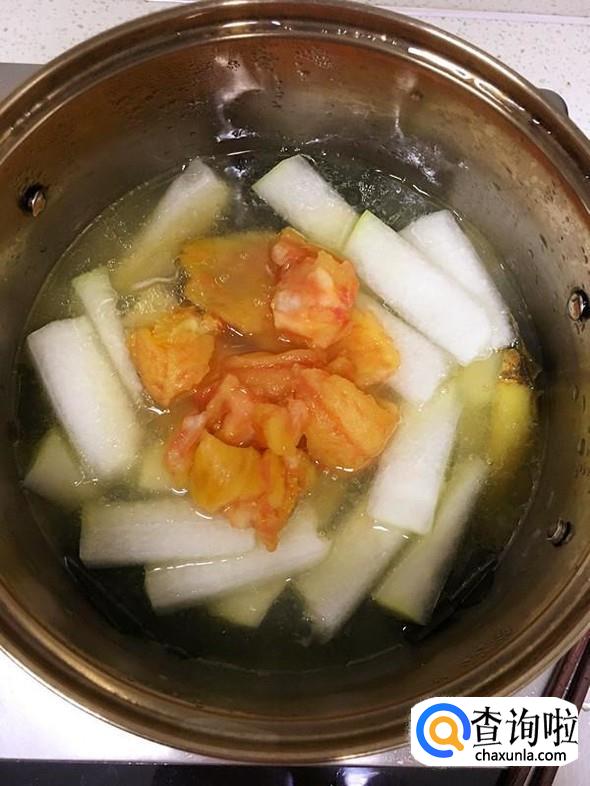切成小块的冬瓜也加入锅中,大火煮开,再转小火2-3分钟左右。
