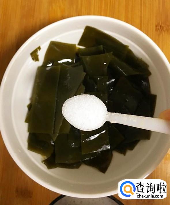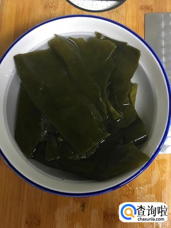 海带泡软并清洗干净后,切成小块,放入碗中,加入1小勺盐,用手抓匀,然后再次用水冲洗干净。