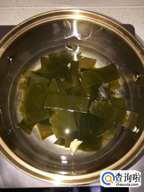 锅中加入适量水,并放入2片生姜,然后把处理好的海带放入锅中,大火煮开后转小火20分钟左右。