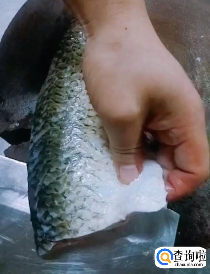 然后我们从鱼骨头中间片开,把鱼骨片除,鱼肉先斜刀45度切(不要切透),再反方向切同样不要切透,如图所示