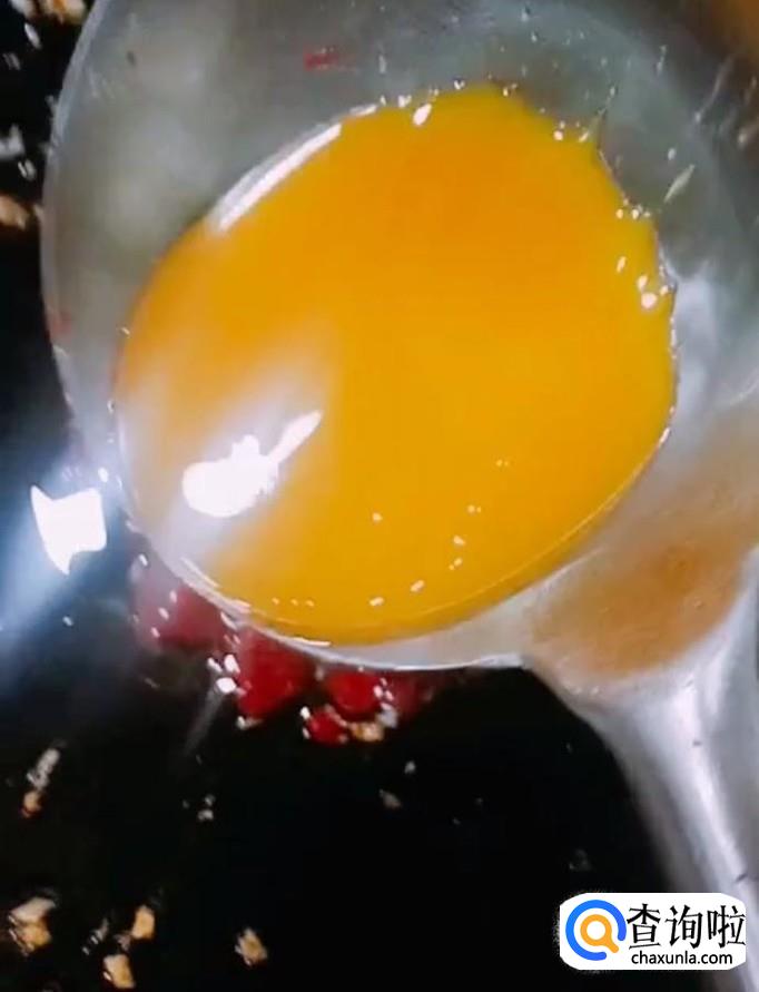 接着我们在锅内留少许底油,放入蒜末,爆香,放入适量的番茄酱,白糖,白醋,橙汁,盐,适量的水,倒入水淀粉勾芡,熬至汤汁浓稠