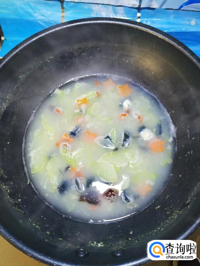 皮蛋适量,佛手瓜适量,胡萝卜适量,香菜适量,盐适量,鸡精适量,香油适量,枸杞子适量。