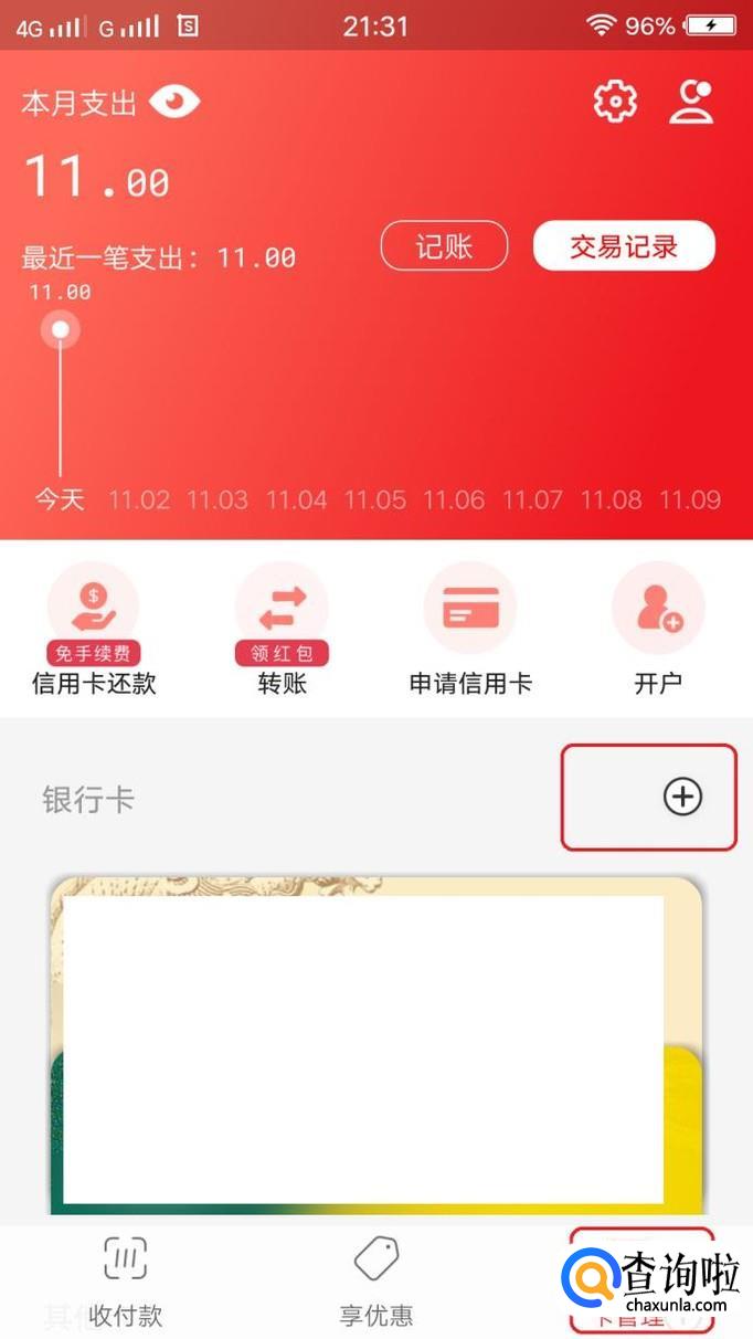 我们要使用二维码,必须先绑卡,进入软件页面后,如图所示,我们点击“卡管理”,然后点击银行卡中的“+”,添加自己的银行卡。