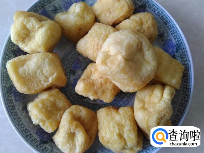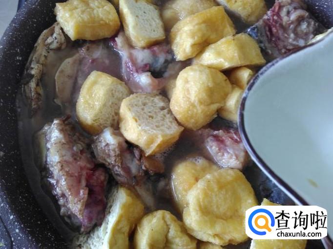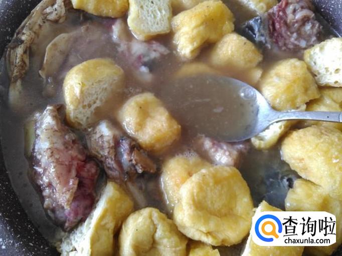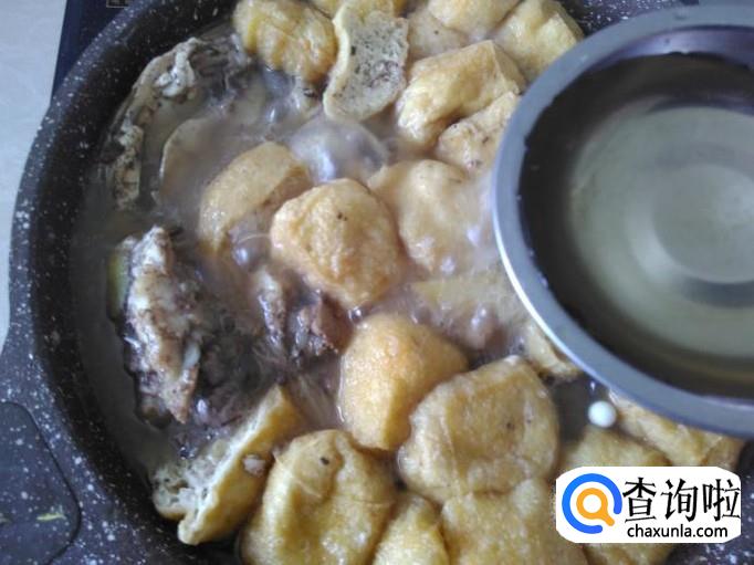 把切成两边的豆腐泡放进锅里。
