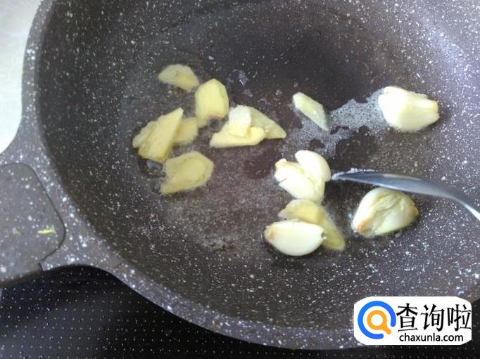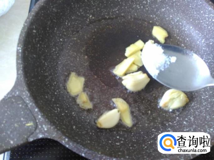 下蒜米、姜片进去,加适量的盐翻炒一下。