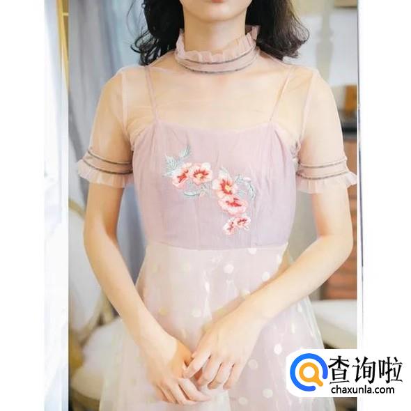 这是两件套的吊带裙,刺绣精致,复古优雅。淡紫色十分温柔。裙摆有两层,外层加入了波点设计,更有复古意味。