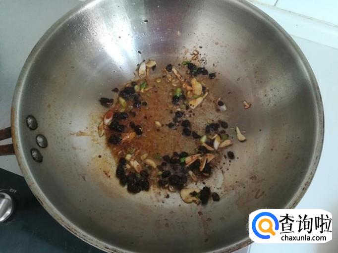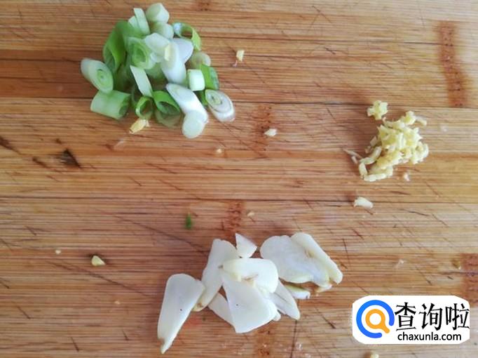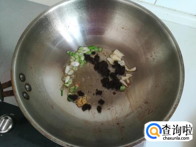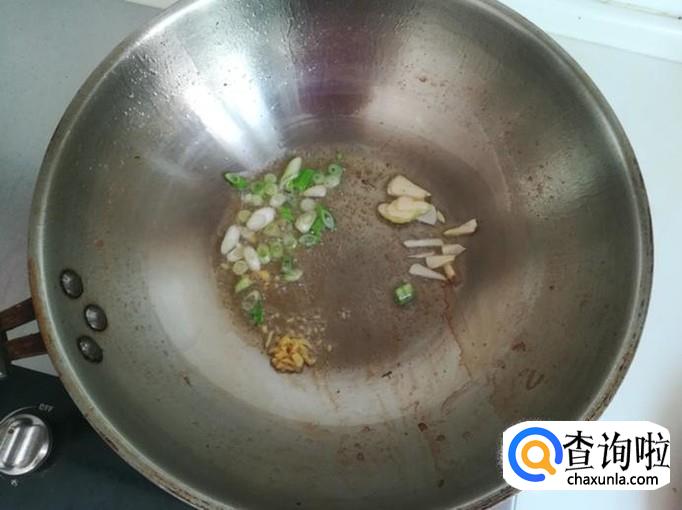 炒锅里放花生油,等油有六成熟时,放入葱姜蒜煸香。