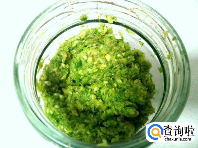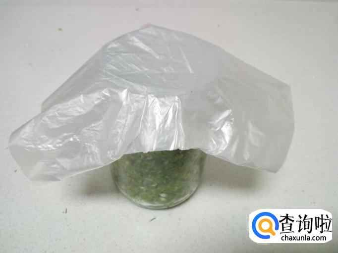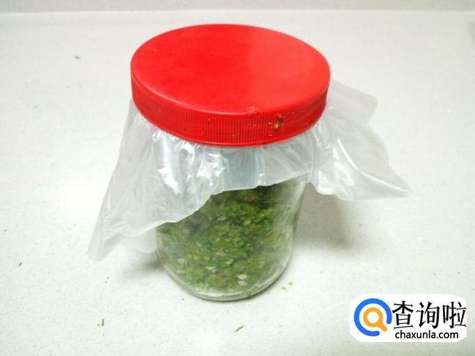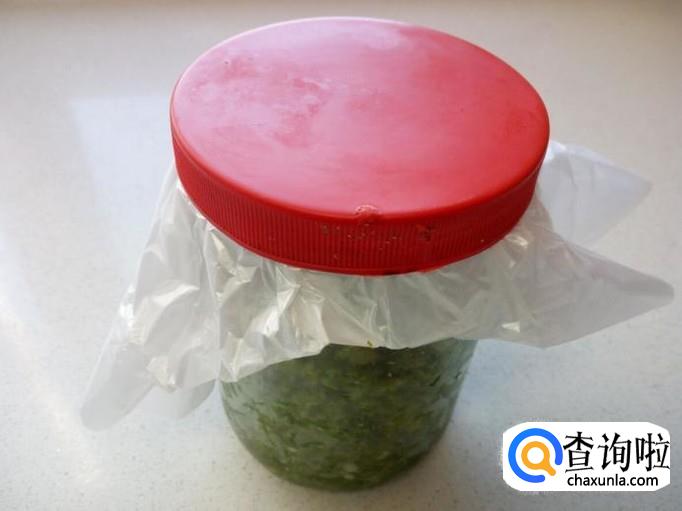 把拌和好的韭菜花放入洗干净的瓶或罐里,然后用保鲜膜密封住口,再拧紧盖,保存起来就可以了。大概半个月左右的时间,就可以发酵成韭菜花酱了。