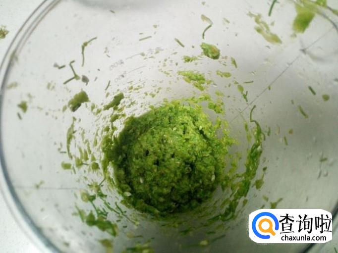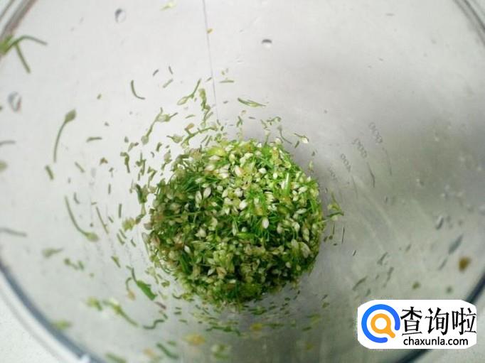 榨汁机清洗干净,控干水分。把切碎的韭菜花放入榨汁机里搅碎(捣碎韭菜花的办法,可以用捣蒜工具,搅拌汁,榨汁机,或者碾压的方法,把韭菜花捣碎成泥状)。