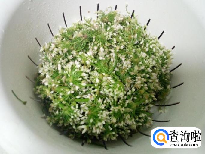 把韭菜花收拾清洗干净,控干水分(我这是购买现成的韭菜花,如果是自己采摘,要尽量采摘韭菜花,不要采摘茎)。
