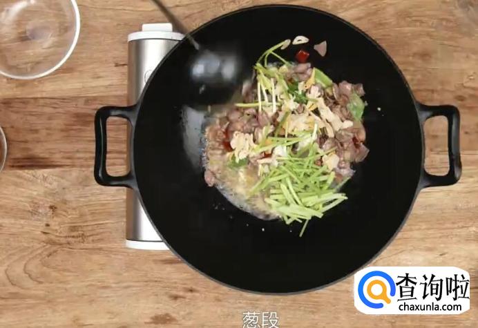 滑入鸡心、鸡肝和鸡胗,加少许黄酒炒至断生。