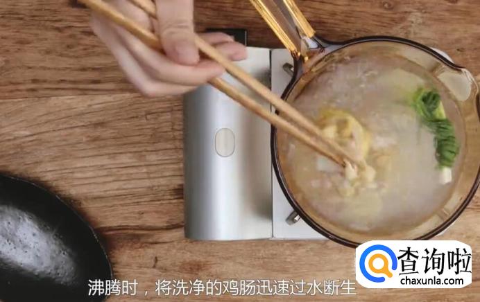 准备一锅葱姜水,沸腾时,将洗净的鸡肠迅速过水断生。