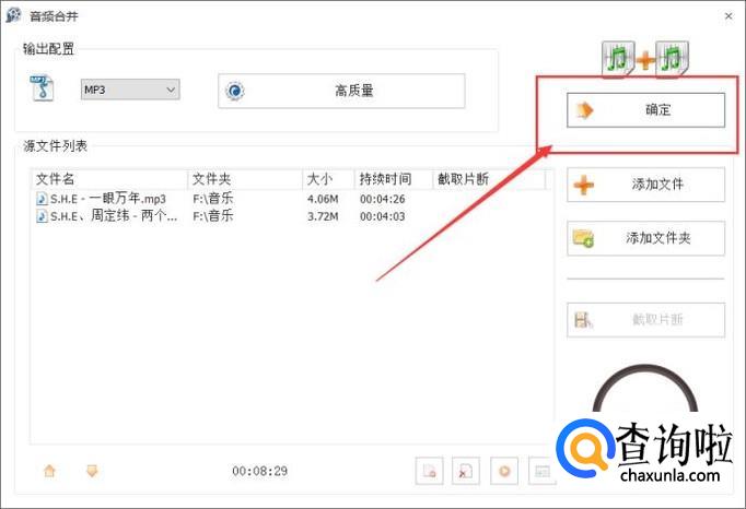 文件选择完毕之后,点击页面右侧的“确定”按钮,将直接添加合并任务到软件主页面。