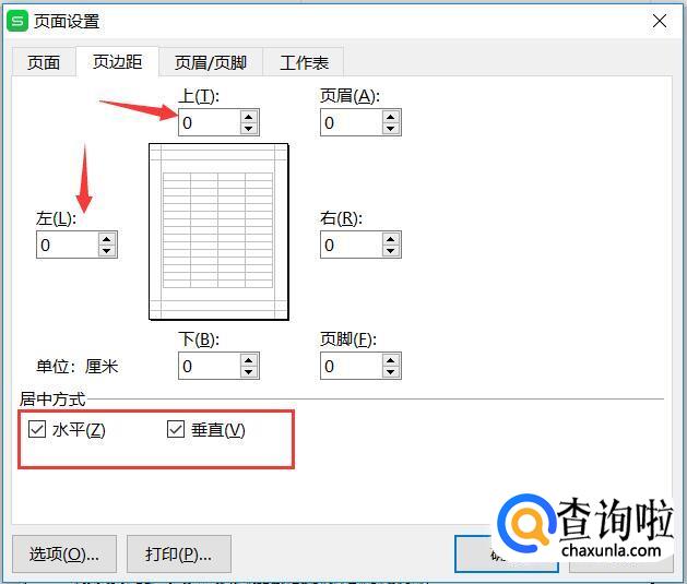 在‘页边距’选项卡里面,我们将其上下左右的边距都设置为0,同时下面的居中方式两个复选框都勾上‘水平’和‘垂直’。