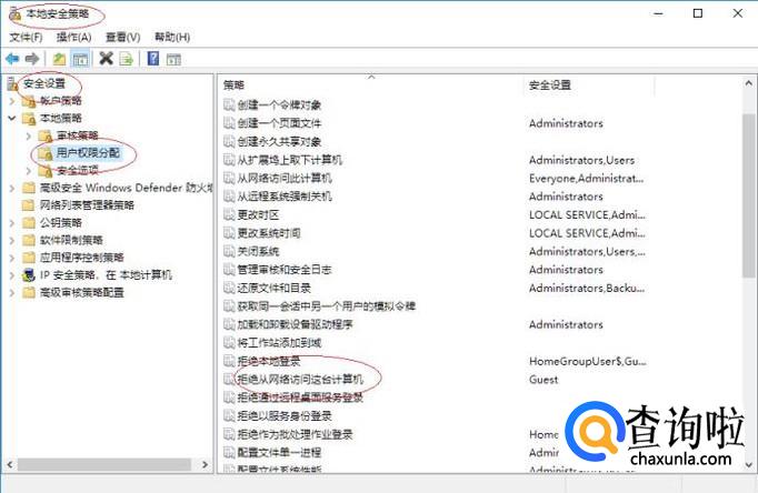展开"本地策略"文件夹,如图所示。选择"用户权限分配"文件夹,鼠标双击右侧"拒绝从网络访问这台计算机"项。