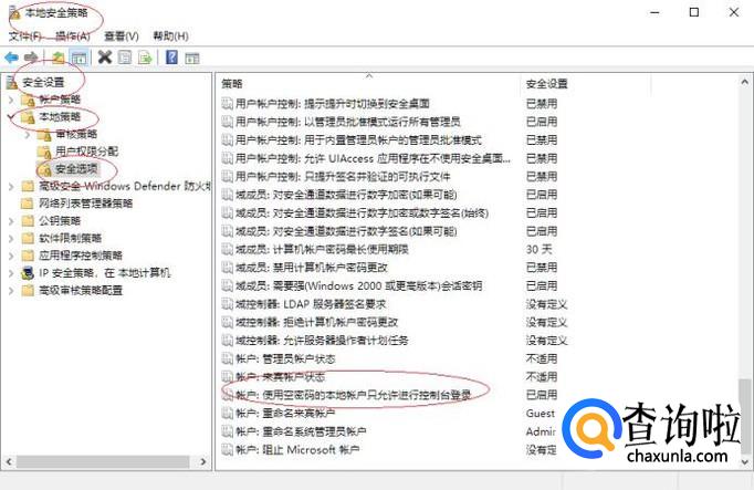 选择"本地策略→安全选项"文件夹,如图所示。拖动右侧垂直滚动条,鼠标双击"账户:使用空密码的本地账户只允许进行控制台登录"项。