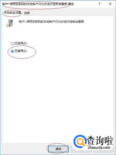 如图所示,弹出"账户:使用空密码的本地账户只允许进行控制台登录 属性"对话框。勾选"本地安全设置→已禁用"单选框,本例到此希望对大家能有所帮助。