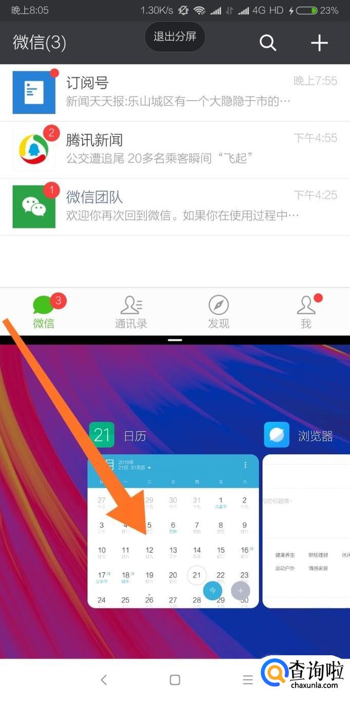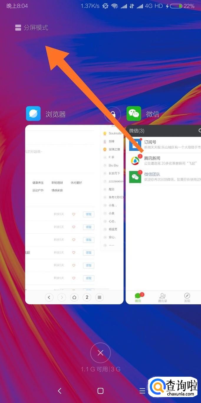 再点击另一款需要分屏运行的应用,最后两款手机应用就能同时在手机屏幕上运行。