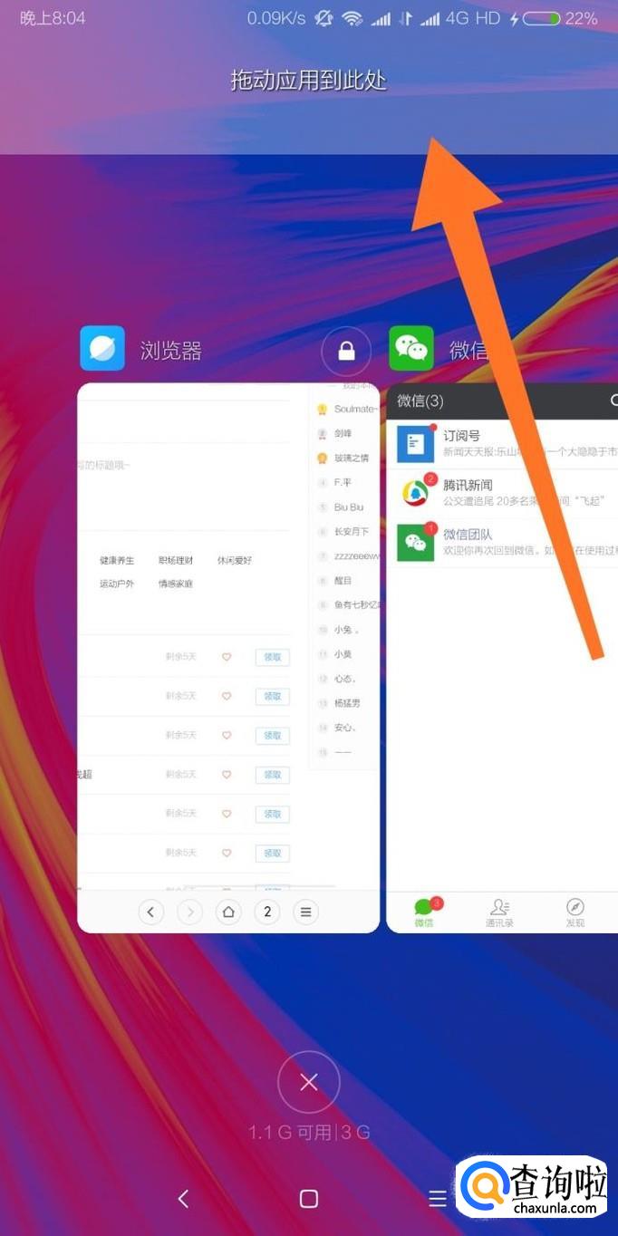 接下来把需要分屏运行的一款应用拖至屏幕上方。