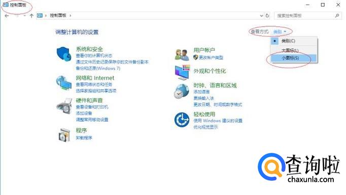唤出"控制面板"程序窗口,查看方式选择"小图标"项。