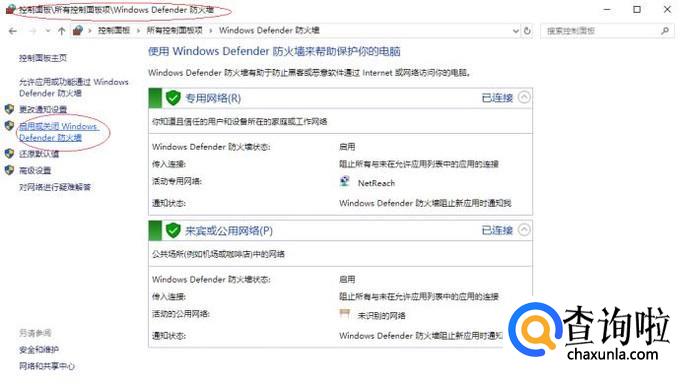 唤出"Windows Defender 防火墙"选项界面,点击左侧"启用或关闭Windows Defender 防火墙"项。