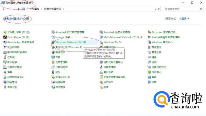 显示所有控制面板项,点击"Windows Defender 防火墙"图标。