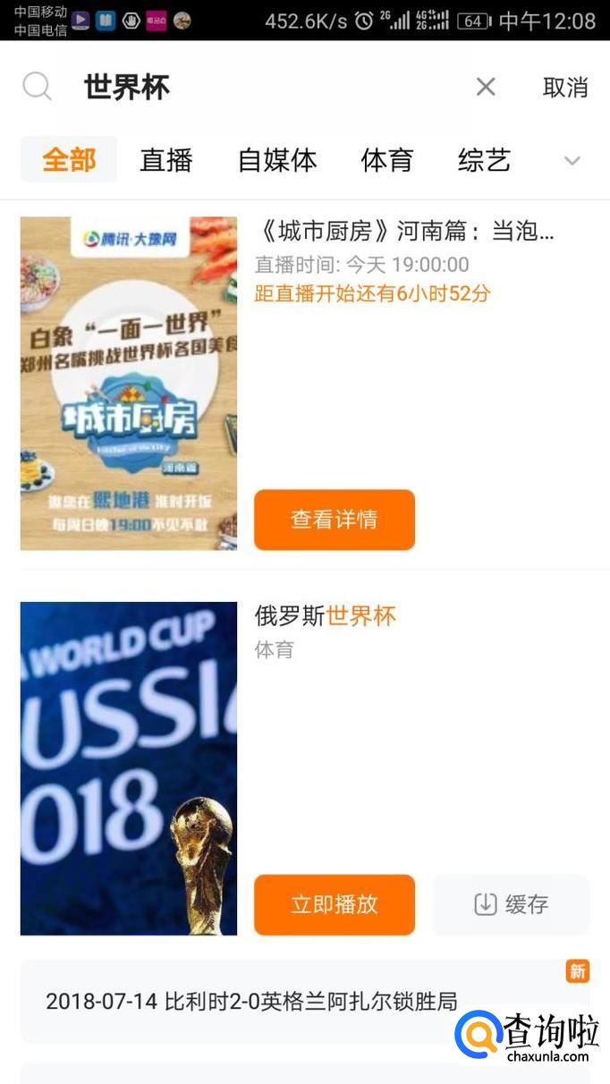 在搜索栏中输入世界杯,在出现的页面中,点击世界杯视频