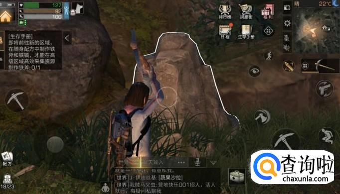 找到石头之后,点击右边的操作按钮,挥动石镐来敲击石头,完成采集动作,在操作按钮的左上方有一个“一件采集”按钮,长按这个按钮,然后等到瞄准在石头上的圈圈变成一个点,再松开,石头就一键采集成功啦,不过这个不能连续使用,有冷却时间的哟。