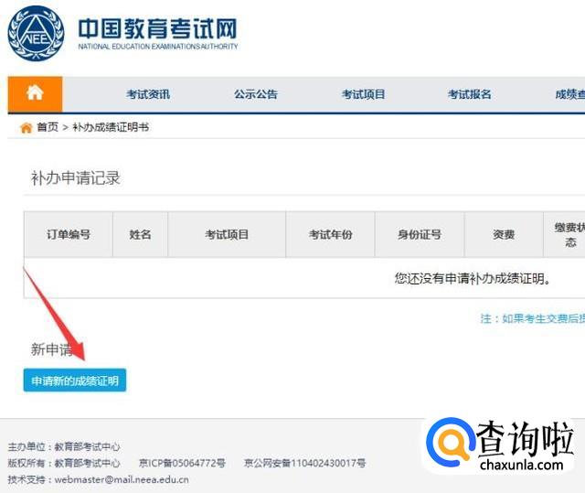 在有了帐号后便可进行登录。在登陆后找到页面下方的“申请新的成绩证明”,并点击进入。在该页面也可查看自己以往申请补办的情况。