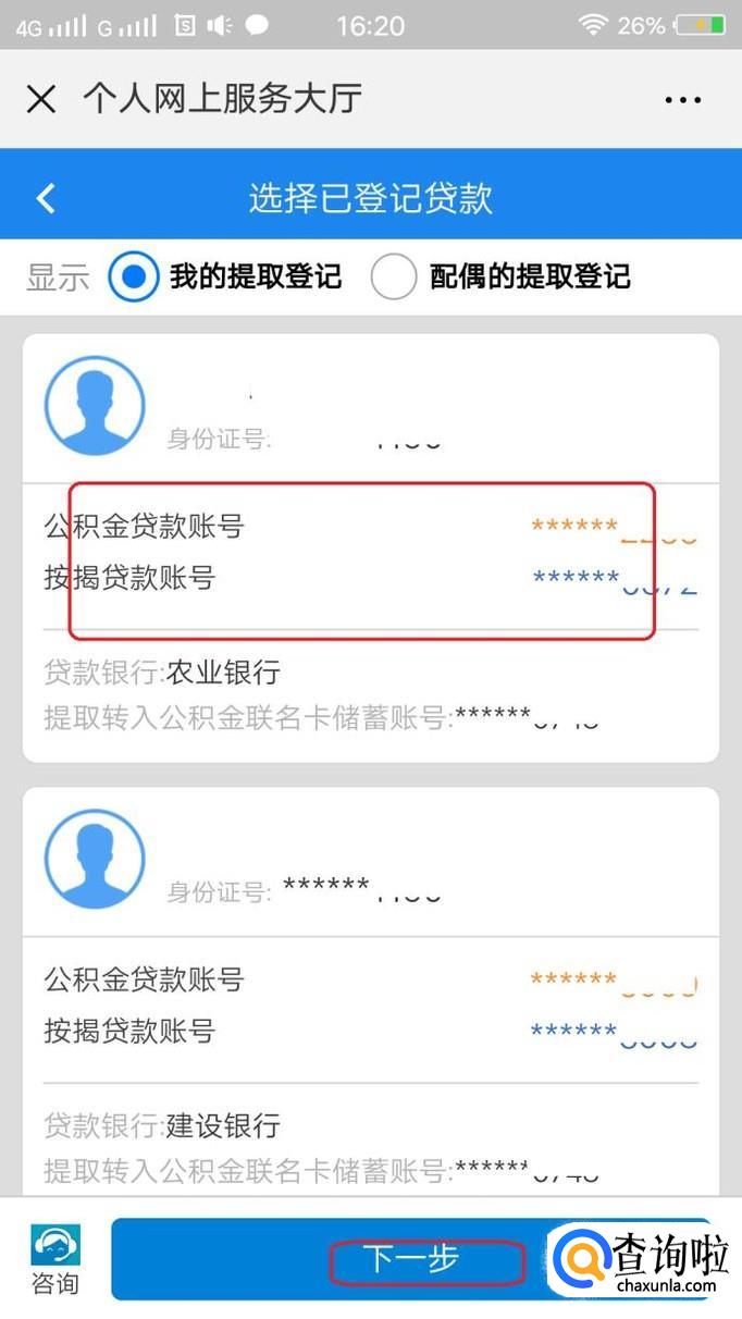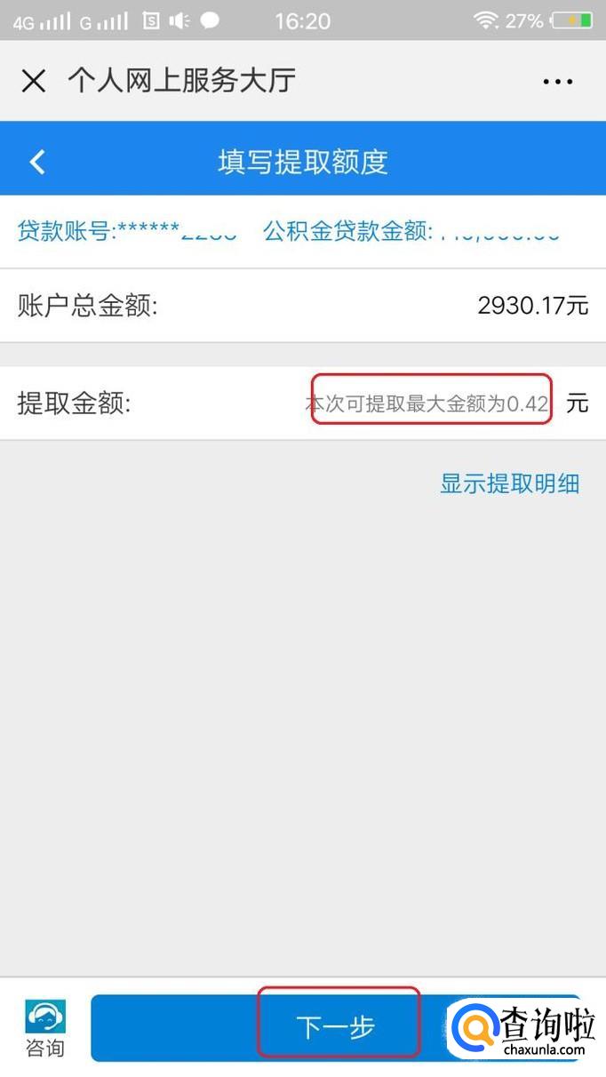 登录之后,就可以看到自身的贷款情况了,我们点击需要提取的那笔贷款,点击“下一步”。