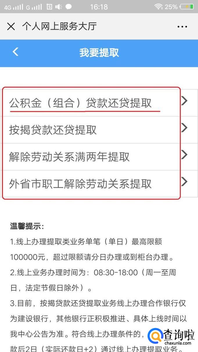 可以看到,当前有四种情况,可以在网上自助支取住房公积金,比如我根据自己情况,点击“组合贷款还贷提取”。
