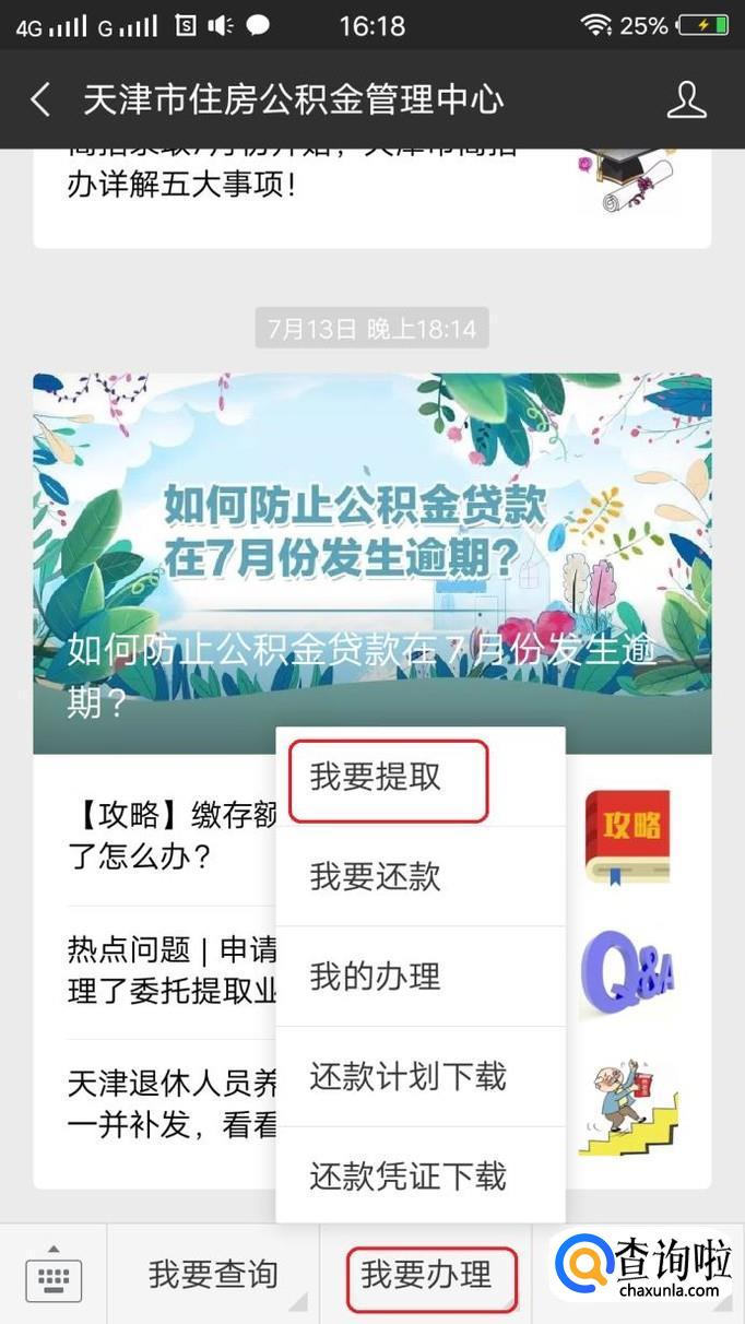 进入公众号以后,点击“我要办理”、“我要提取”。