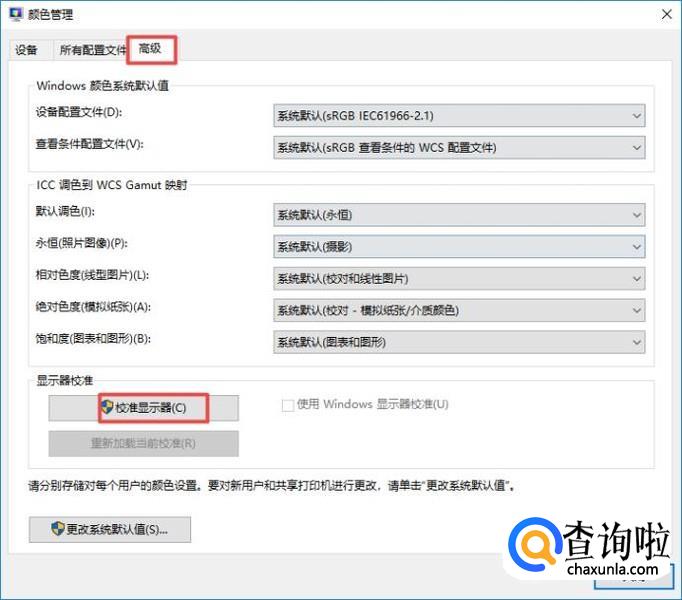 然后点击高级,之后点击校准显示器;