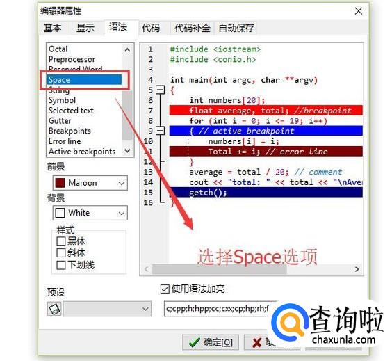 首先在编辑器属性界面中,切换到语法选项卡,然后选择Space选项,如下图所示