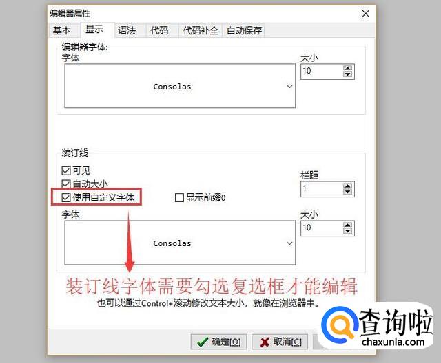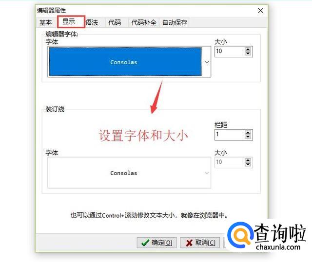 接下来在弹出的编辑器属性界面中,切换到显示页卡,如下图所示,在编辑器字体中可以修改字体的类型和大小