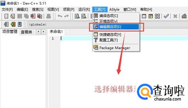 首先打开Dev C++编辑器,点击顶部的工具菜单,然后选择编辑器选项,如下图所示