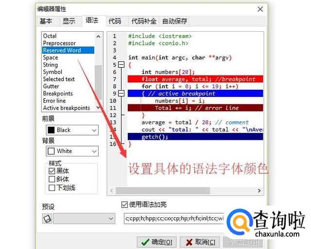 接下来切换到语法选项卡,在此界面中我们可以选择要设置的字体类型,然后精确的设置此类型的字体颜色,如下图所示