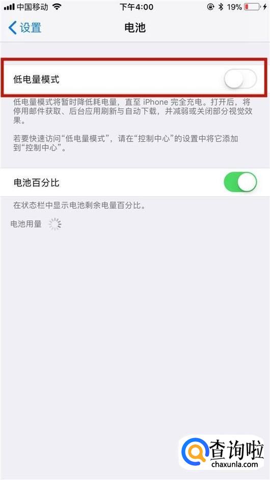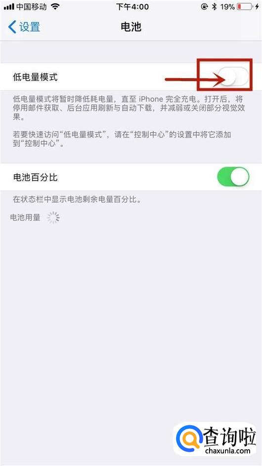 接着点击开启低电量模式开关,如下图所示。
