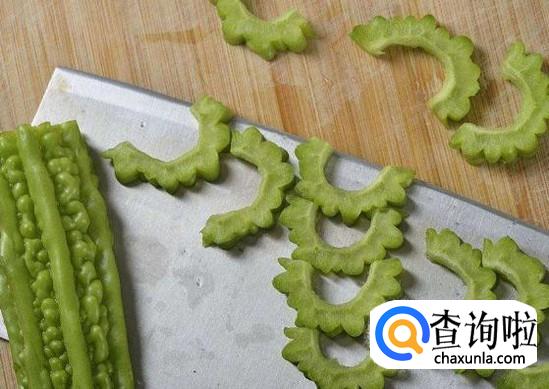 用刀把苦瓜切成薄片。