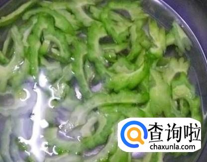 锅中烧开水,将苦瓜片放入锅中,焯一下。时间不宜长,否则苦瓜就不脆了。