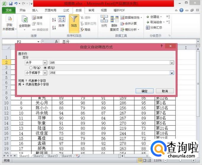我们以条件“总分大于265或小于等于250为例”