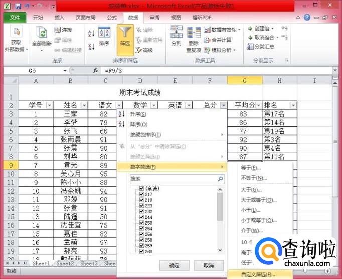 单击“总分”下的三角,然后在菜单中,选择“数字筛选”中的“自定义筛选”