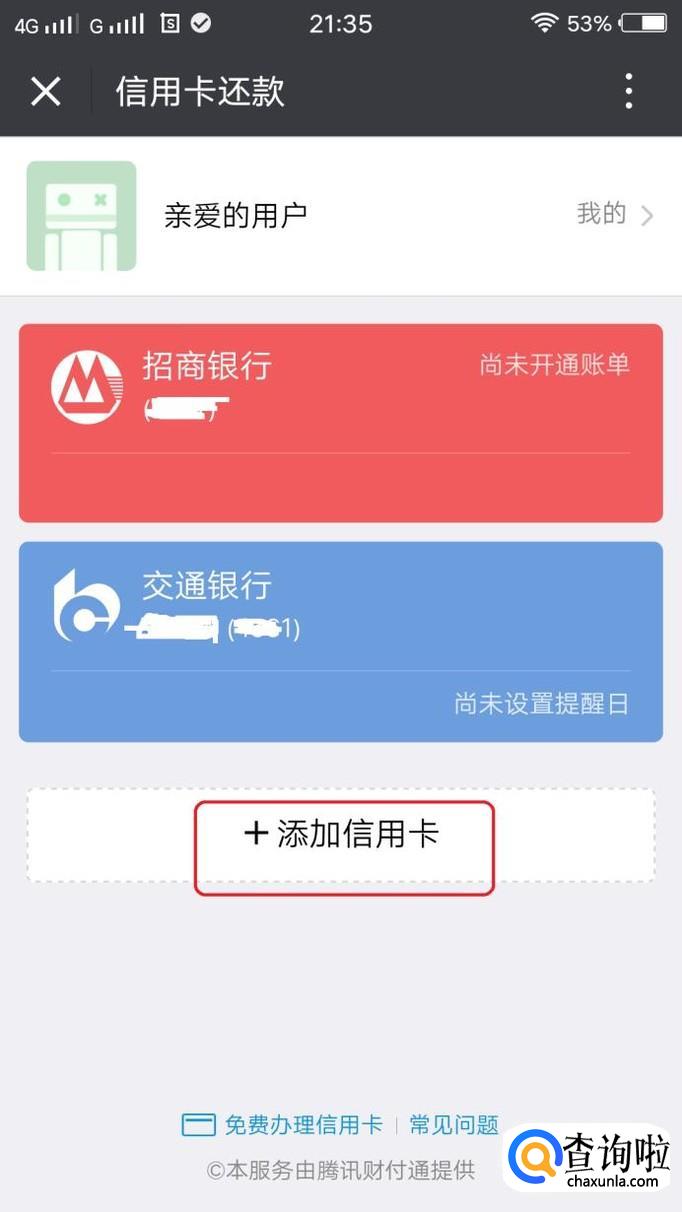 进入“信用卡还款”界面,点击“添加信用卡”,把交通银行信用卡绑定(会有输入信用卡卡号、信息和手机短信验证环节),就变成下方这样的界面了。点击“交通银行”信用卡就可以还款了。