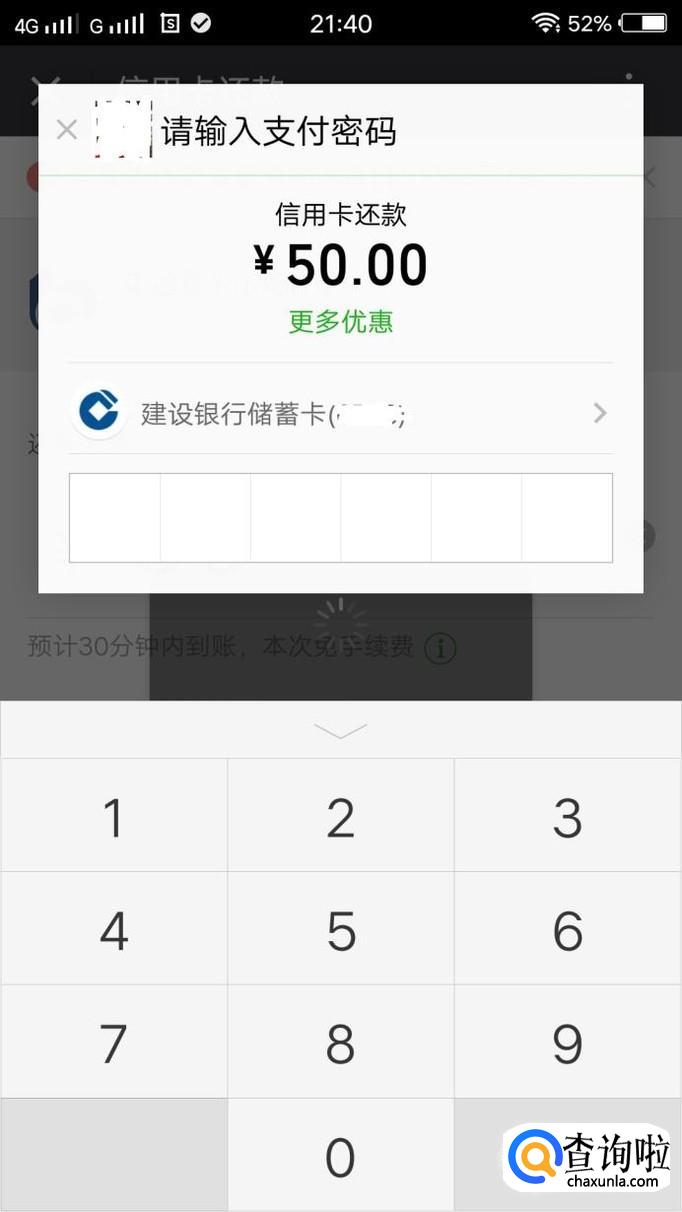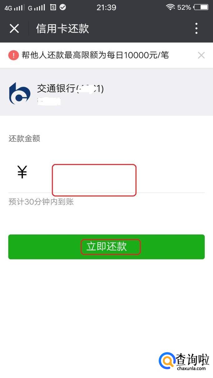 输入还款金额,点击“立即还款”,进入微信支付,选择一张储蓄卡还款就可以了,一般30分钟内还款金额就能到账。