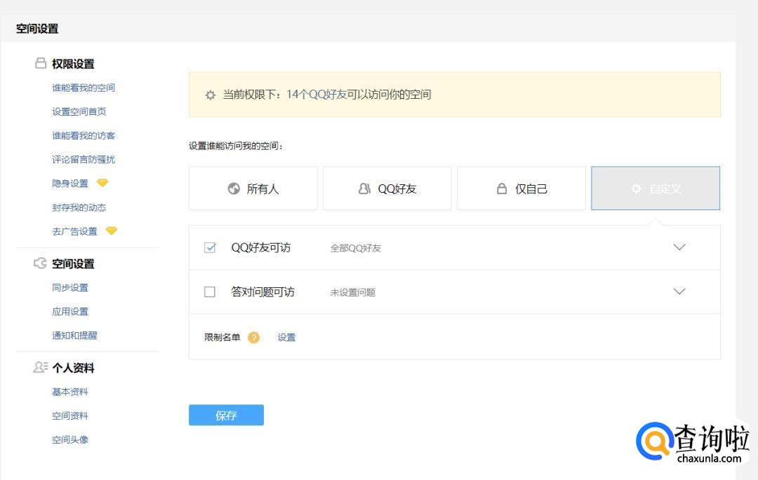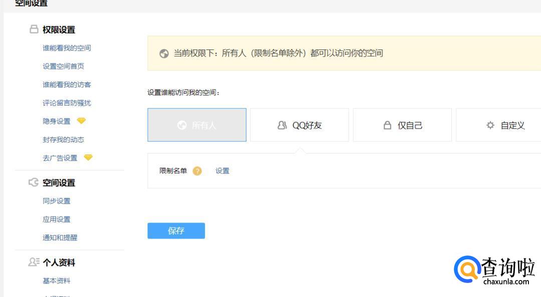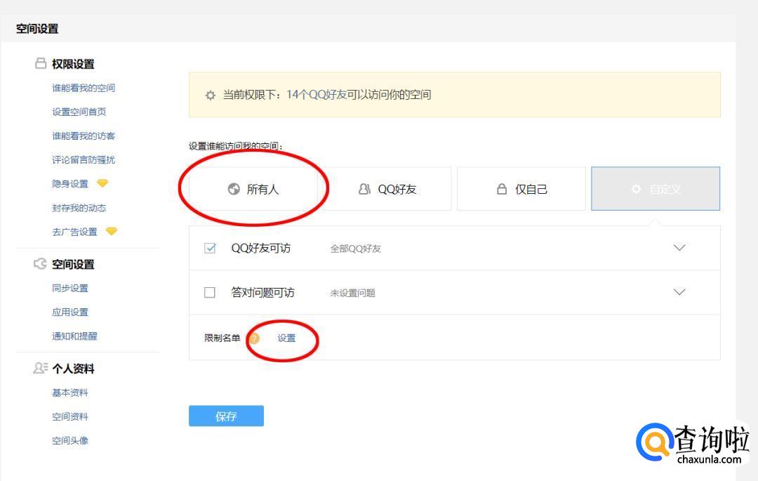 把“谁可以访问我的空间”的选项选择“所有人”即可。