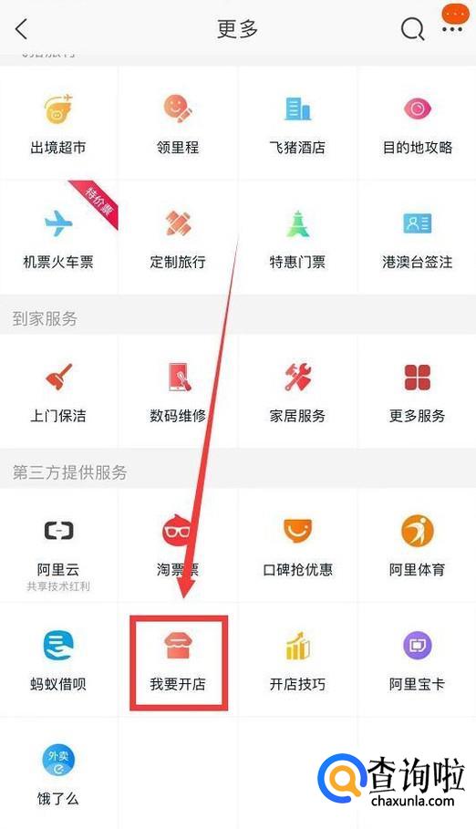 进入新的界面后,一直往下滑,在最下面的第三方提供服务里有一个“我要开店”,选择它。