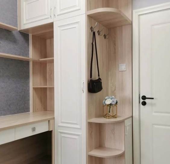 如果衣柜面积不大,没空间留开放区的话,也可以在衣柜侧边装挂钩,临时换下的一两件外套,也可以挂在这里。